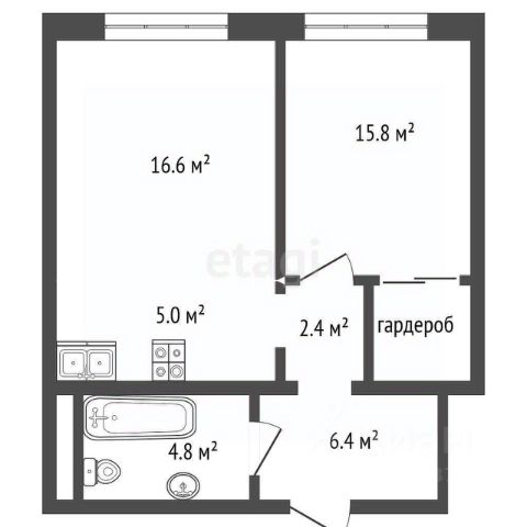 Однокомнатная квартира в кирпичном 5-ти этажном доме, общей площадью 41,9 кв. м., плюс утепленная лоджия 7,6 кв. м., окна квартиры выходят во двор дома.