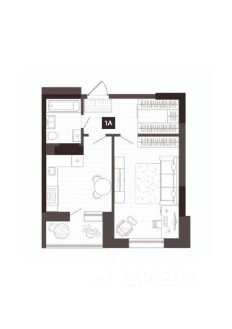 Квартира с кухней-гостиной и одной спальней в квартале "Новин". Особенности планировки: вид во двор, панорамное остекление, постирочная, потолки 3 м и выше, предчистовая отделка, терраса.