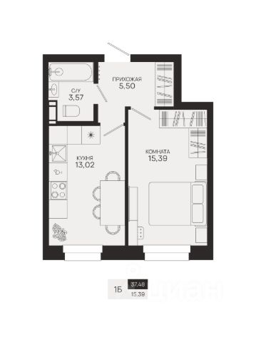 Квартира с кухней-гостиной и одной спальней в квартале "Новин". Особенности планировки: вид во двор, предчистовая отделка, терраса, постирочная.