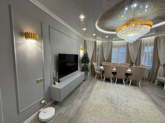 ПОДХОДИТ ПОД СУБСИДИЮ! Пpoдaется очень красивая 2-комнатная квартира в 9а микрорайоне города на Рябиновом бульваре, площадью 88,5 кв.м. Просторная, светлая, тeплая, уютная, нестандартной планировки: - кухня-гостиная -25,3 кв.м. - спальная комната - 15,6 кв.м. с балконом - 5,6 кв.м. - комната - 18,9 кв.м. - гардеробная - 8,6 кв.м. - коридор - 13,2 кв.м. - прихожая-4 кв.м. - ванная и туалетная комната - 4,8 кв.м. В квартире выполнен дизайнерский ремонт в светлых оттенках. Установлены пластиковые окна, на полу - ламинат, натяжные потолки, современные межкомнатные двери, панорамные окна на балконе, качественные обои и декоративная плитка на стенах, входная металлическая дверь. В ванной/туалетной комнате - плитка, инсталляция. Балкон обшит декоративной плиткой. Проведена замена электропроводки, установлено исправное сантехническое оборудование: приборы учета воды, смесители в санузле и кухне; электрооборудование: приборы учета электроэнергии, розетки, выключатели, осветительные приборы. Квартира оснащена: - встроенный кухонный гарнитур с бытовой техникой: холодильник, варочная панель, духовой шкаф, посудомоечная машина; - кондиционер - стиральная машина в ванной комнате - встроенная гардеробная - встроенный вместительный шкаф-купе в коридоре. Квартира наполнена красивой качественной мебелью: - в гостиной: встроенный кухонный гарнитур, модульный раскладной диван, стол, стулья, ковер, шторы, тюль, люстра, точеные светильники; - в комнате: встроенный шкаф-купе, кровать, рабочий стол, стулья, комод, туалетный столик, зеркало с подсветкой, шторы, тюль, точеные светильники; - в спальной комнате: угловой шкаф с зеркалом, кровать, комод, тюль, шторы, люстра; - на балконе: пуф, шкаф, точечные светильники, настенные светильники; - в прихожей: пуф, точечные светильники, зеркало. В квартире все продумано до мелочей: - в гостиной расположены - зона отдыха и обеденная зона; - в коридоре- большой шкаф-купе, вмещающий в себя различные полки, места для хранения верхней одежды, повседневной одежды, хозяйственной атрибутики; - вместительная гардеробная является отдельным пространством в квартире для хранения всевозможных вещей - от банок, до новогодней елки, обуви, чемоданов для отпуска и мн.др.; - просторная жилая комната -18,9 кв.м., являющая в настоящий момент комнатой подростка, может легко разместить мебель для двоих детей; - спальная комната, с выходом на уютный балкон с панорамными окнами - является местом отдыха и релакса; - cанузел -уютный и удобный - оснащен вместительной ванной, удобным зеркалом и тумбой; - прихожая оснащена большим зеркалом. Oкнa выxoдят нa Рябиновый бульвар -излюбленное место горожан для пеших прогулок и отдыха. Кваpтира наполнена светом, свежим воздухом. При продаже в квартире остается вся мебель и бытовая техника, кроме камина, телевизоров, холодильника (под вопросом). В доме - ухоженный, чистый подъезд и придомовая территория, современная детская и спортивная площадки. Большая парковка возле дома. По периметру дома установлены в Продам 2-комнатную квартиру 90 м2 (квадратных метров) в Нижневартовске.