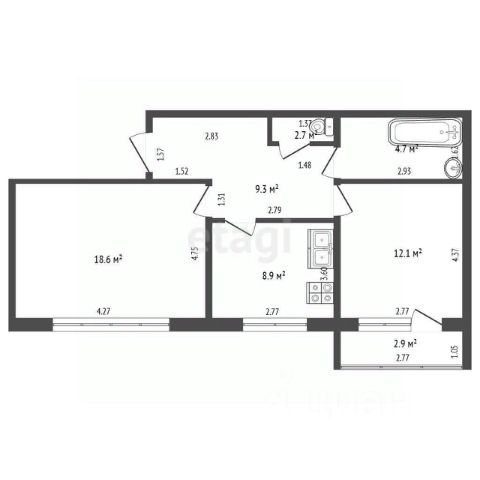 Трехкомнатная квартира с индивидуальной планировкой, в кирпичном доме, общей площадью 44,1 кв. м + лоджия 7,4 кв. м.