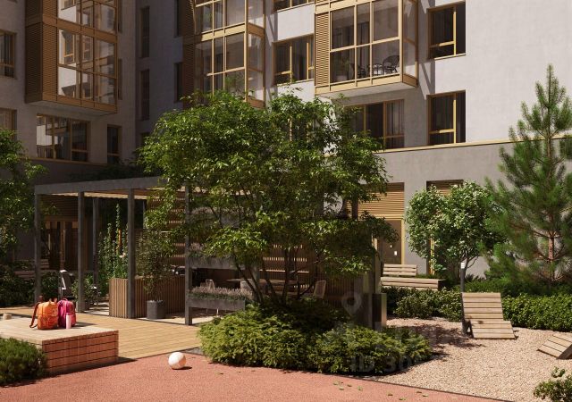 Во дворах предусмотрены сценарии для разных категорий жителей, в том числе и площадки для тихого отдыха с фонтаном и арт объектом.