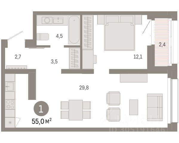 Квартира с кухней-гостиной и двумя спальнями в квартале "Новин". Особенности планировки: балкон, гардеробная, двухуровневая, ипотека 0,11%, предчистовая отделка, терраса на крыше.