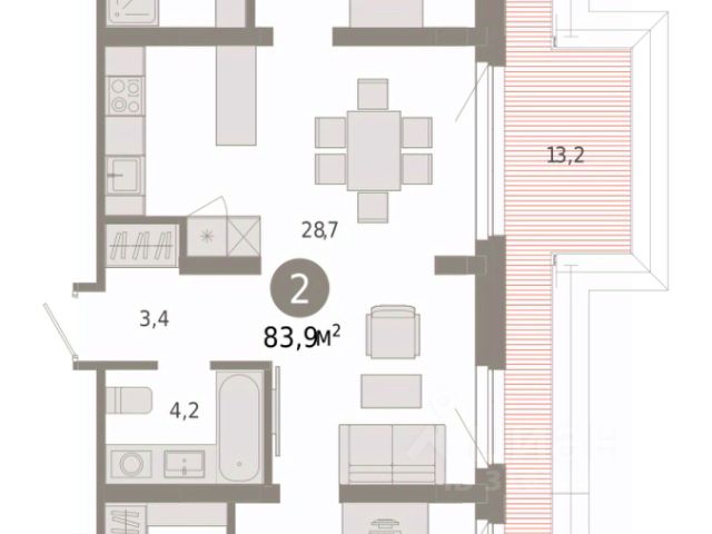 2-комн. квартира с предчистовой отделкой в ЖК "Новин" на 8 этаже. 2-уровневая квартира, на каждом этаже вы можете выделить различные функциональные зоны. Общая площадь: 89.98 кв.м., жилая: 23.4 кв.м., площадь просторной кухни-гостиной: 20.6 кв.м. Квартира угловая, очень светлая, естественная вентиляция при открытии окон. В квартире два балкона, один совмещенный санузел. Наличие террасы размером 21.3 кв.м. в квартире дает возможность для обустройства дополнительной площади. Высота потолков 2.74 м.