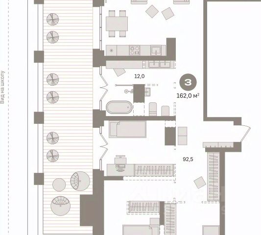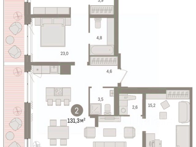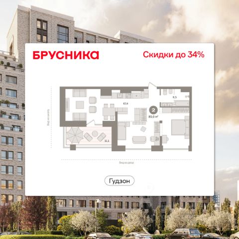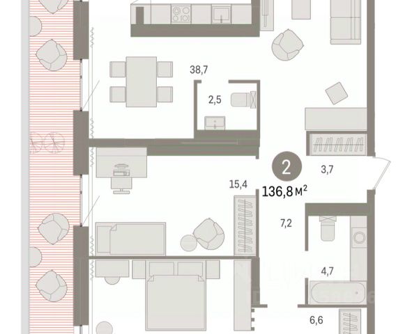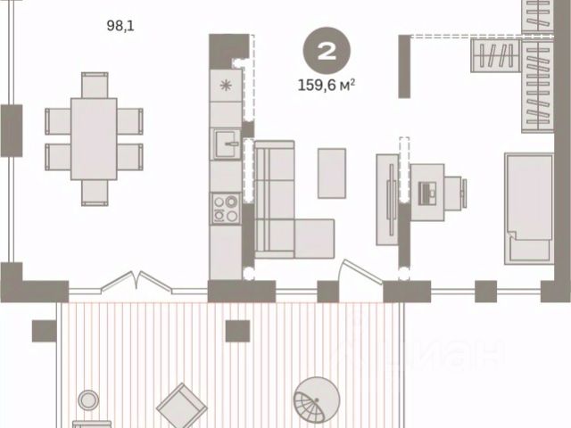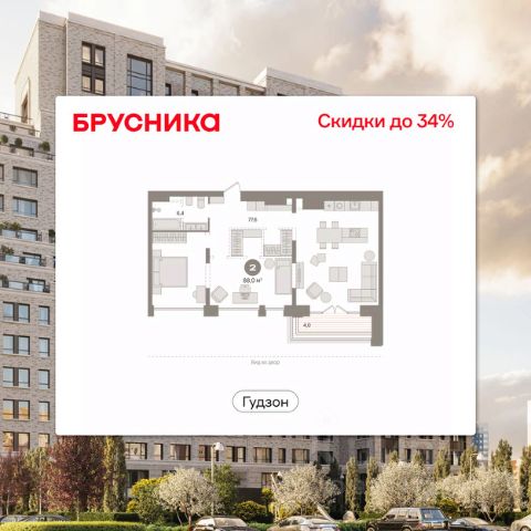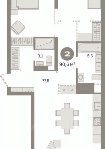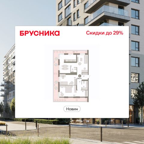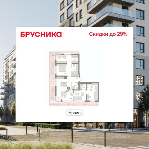 Квартира с кухней-гостиной и двумя спальнями в квартале "Новин". Особенности планировки: гардеробная, ипотека 0,11%, мастер-спальня, окна на две стороны, постирочная, предчистовая отделка, разнесённые спальни, терраса.