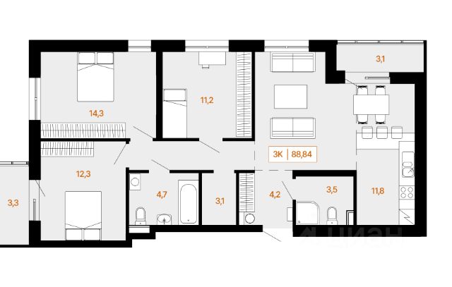 Квартира с кухней-гостиной и двумя спальнями в квартале "Новин". Особенности планировки: балкон, предчистовая отделка.