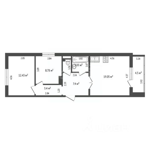 Двухкомнатная квартира в капитальном исполнении общей площадью 64,4 кв. м., + лоджия 4,6 м².