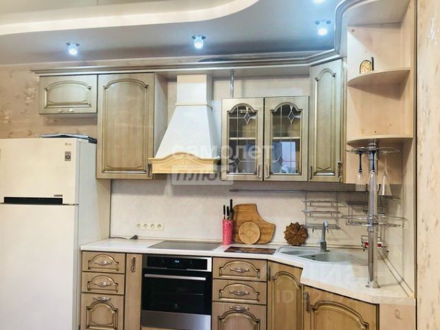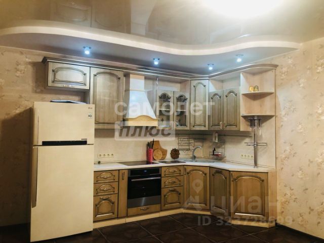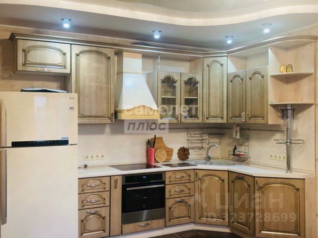 Кухня-гостиная очень просторная - 18,4 кв.м.! Установлен очень эргономичный гарнитур цвета светлого ореха со встроенной техникой - просто рай для хозяйки! Идеально разместится обеденный стол со стульями для уютных семейных обедов и званных ужинов! И уютный диван с ТВ в зоне отдыха.