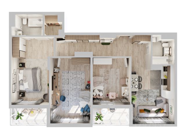 Мы создали удобные планировки квартир для каждого, от компактных однокомнатных до просторных трехкомнатных квартир с отделкой "ПОД КЛЮЧ". Всего в доме будет 288 однокомнатных квартир, 224 двухкомнатных квартиры, 64 трехкомнатных квартиры. Здесь вы найдете все необходимое для комфортной жизни: просторную кухню, места для хранения, уютные спальни и функциональные ванные комнаты. На первом этаже дома предусмотрены коммерческие помещения разной площади, просторные проходные подъезды и парковочные места.