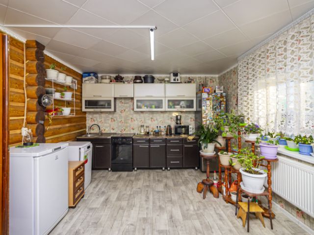 В доме просторная гостиная, 2 спальни, кухня, сан.узел, и отапливаемая пристройка дополнительные 9 кв. м., отсекающая холод и, одновременно, оборудована стеллажами для хранения. В санузле и прихожей тёплый пол с водяным отоплением. Встроенная плита, посудомойка и духовка. В зале огромный встренный шкаф длиной 4.5 метра под хранение всего необходимого.