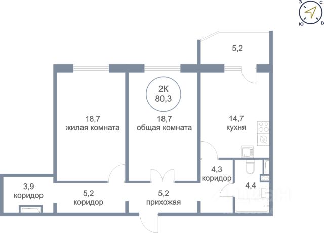 Жилая площадь квартиры составляет 42,6 кв. м (14,7кв. м,19,0 кв. м, 8,9 кв. м),