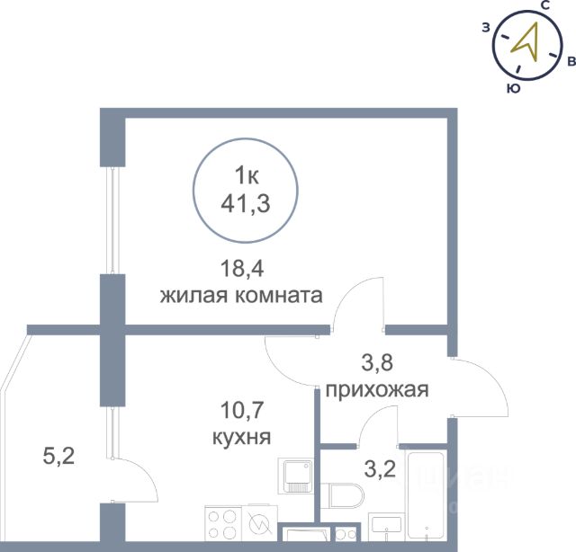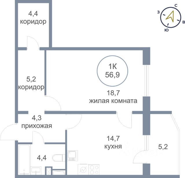 Кухня, гостиная, спальня, раздельный сан.узел и большой гардеробный шкаф-купе в коридоре.