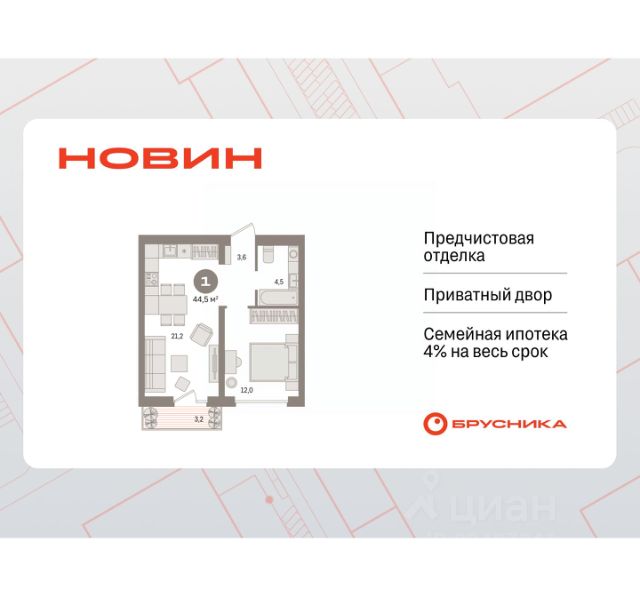 Готовые квартиры со скидкой до 35%. По всем вопросам звоните в офис продаж, мы вам все подробно расскажем! Однокомнатная квартира с предчистовой отделкой в ЖК "Новин" на 6 этаже. Общая площадь: 44.47 кв.м., жилая: 12 кв.м., площадь просторной кухни-гостиной: 21.1 кв.м. Все окна выходят на одну сторону. В квартире один балкон, один совмещенный санузел. Высота потолков 2.7 м. Дом монолитный, многоподъездный, переменной этажности, от 8 до 17 этажей. Квартира находится во 2-й секции высотой 9 этажей в корпусе 7. На этаже 7 квартир. В подъезде 1 пассажирский и 1 грузовой лифт. Окончание строительства - 2 квартал 2027 года. Оформление сделки по договору долевого участия. Квартира с кухней-гостиной и одной спальней в квартале "Новин". Особенности планировки: вид во двор, предчистовая отделка, балкон. квартиры в нашей базе: НСВ07-Ж2.6.7. Квартал "Новин" расположен на западе Сургута в районе с хорошо развитой инфраструктурой. Рядом — парк "Кедровый Лог", детские сады, поликлиника, продуктовые магазины и торговые центры. До центра города — 20 минут на автомобиле. Пять домов уже заселены. Ещё три находятся на этапе возведения. Квартал находится в западной части Сургута на пересечении Югорского тракта и улицы Игоря Киртбая. Можно быстро добраться до любой точки города по Югорскому тракту. В районе уже сформированная инфраструктура. Рядом расположены крупные торговые центры, три детских сада, поликлиника, парк и спортивная база. На первых этажах квартала спроектированы коммерческие помещения под повседневные сервисы для жителей: магазины, кафе, аптеки и другие полезные функции. Проектом развития территории предусмотрено строительство детского сада и общеобразовательной школы. Во дворах предусмотрены сценарии для разных категорий жителей, в том числе и площадки для тихого отдыха с фонтаном и арт объектом. Детская площадка раскрывает игровой потенциал территории за счёт разных возможных типов взаимодействий, среди которых присутствуют: контакт с природой, смена уровня игры и контролируемый риск, сотрудничество и игра в команде, а также спокойный сценарий с качелями. Между домами второй очереди мы спроектировали общественное пространство. Здесь также расположатся спортивные и игровые площадки, велопарковки и площадь событий. Главной точкой притяжения станет фонтан. #Z5bl47