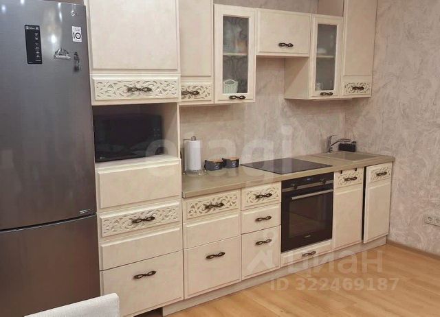 Кухня просторная с выходом на балкон. Установлен кухонный гарнитур. Вытяжка, плита, холодильник, микроволновая печь. Идеально разместился обеденный стол со стульями для уютных семейных обедов и званных ужинов.