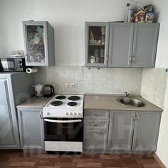 на кухне: кухонный гарнитур, встроенный шкаф, микроволновая печь, варочная панель, духовой шкаф, холодильник, диван, стол, стулья.