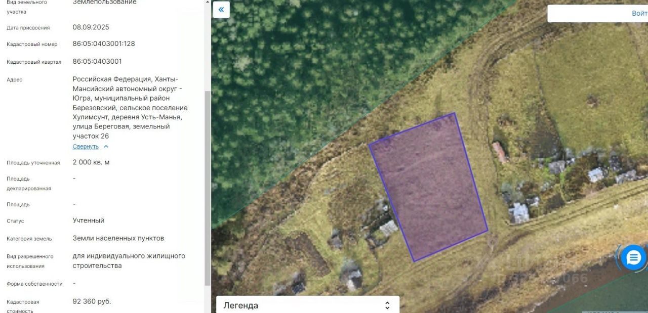 Земельный участок с кадастровым номером 86:05:0403001:128 площадь 2000 по адресу Российская Федерация, Ханты-Мансийский автономный округ - Югра, муниципальный район Березовский, сельское поселение Хулимсунт, деревня Усть-Манья, улица Береговая, земельный участок 26