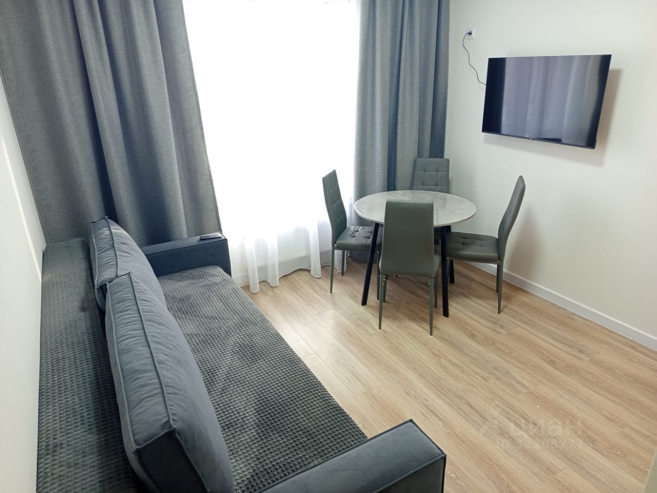 Гостиная: Двухместный диван для отдыха и телевизор.