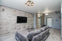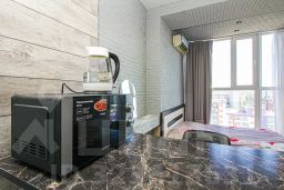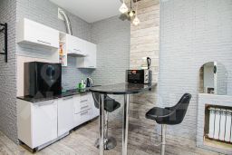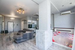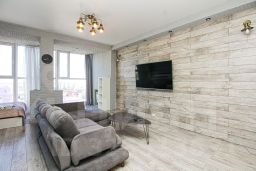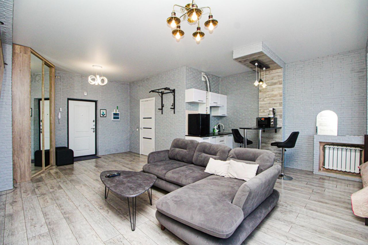 В апартаментах имеется все необходимое для комфортного проживания : двуспальная кровать с ортопедическим матрасом (160х200), двуспальный диван, кондиционер, кухня со всем необходимым (холодильник, варочная панель, микроволновая печь, чайник, а так же посуда, приборы, просторное панорамное окно с удобным диваном и столиком, стиральная машина, фен, утюг, гладильная доска, сушилка для одежды, Smart TV (онлайн-кинотеатры, RUTUBE) и высокоскоростной Wi-Fi, отдельное рабочее место, шкаф купе, шампунь, гель для душа, жидкое мыло, ватные палочки, ватные диски, стиральный порошок, чай, кофе, сахар, соль, масло. На каждого гостя предусмотрено по 2 полотенца.