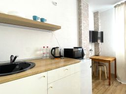 Студии от 18 до 25 кв. м подойдут для проживания до 4 человек. Они имеют лаконичный дизайн, позволяющий вместить в малую площадь все необходимое для комфортной жизни. Гостям предоставляются туалетно-косметические принадлежности и тапочки, в квартире есть телевизор с кабельным ТВ, Wi-Fi входит в стоимость проживания. Для гостей на автомобиле есть бесплатная парковка.