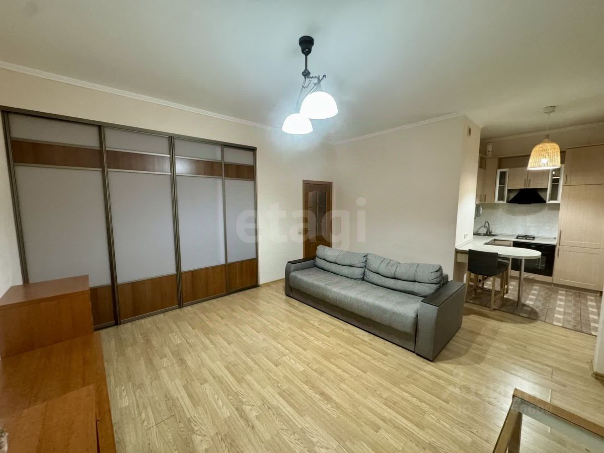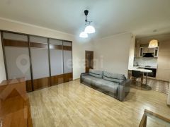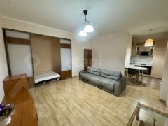 Квартира имеет площадь 42,7 квадратных метра и состоит из просторной комнаты, кухни, совмещенного санузла и балкона. В прихожей есть шкаф-купе для хранения вещей, а также удобная кровать и диван.