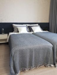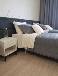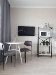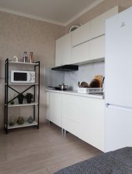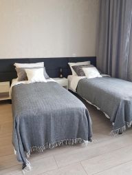1-комнатные апартаменты-студия улучшенные В квартире есть всё необходимое для комфортного проживания: две односпальные кровати (при желании сдвигаются до полноценной двуспальной кровати), мини-диван с рабочим местом, обеденная зона, стиральная машина, холодильник, плита, телевизор, WI-FI, собственная ванная комната и туалет.