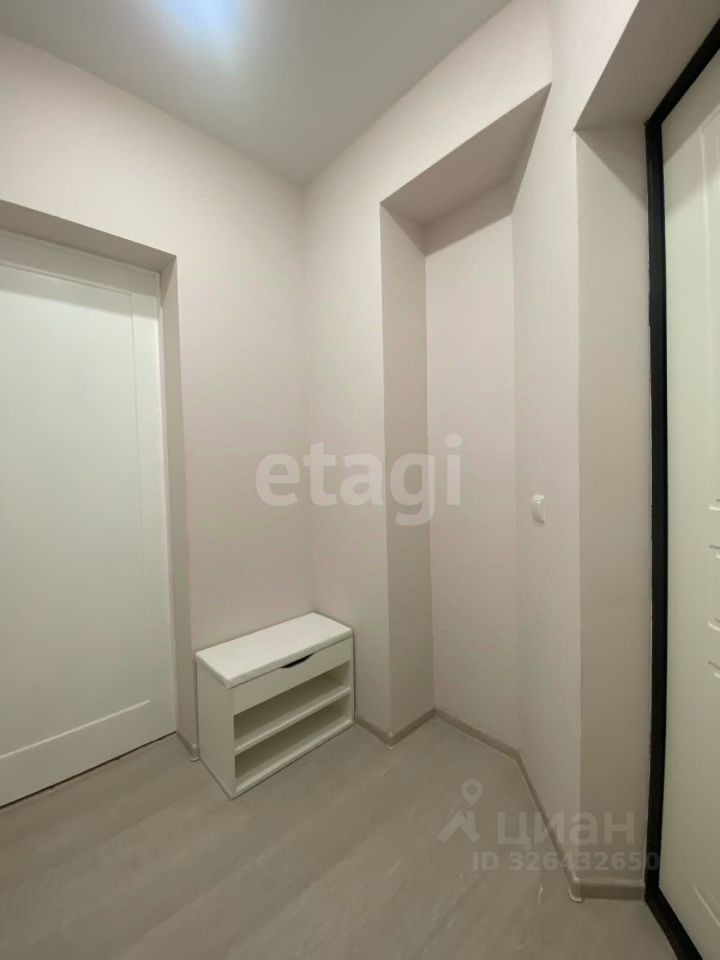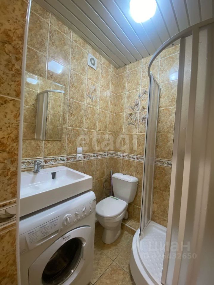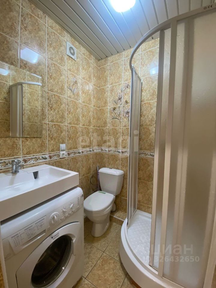 Квартира укомплектована всем необходимым: есть диван, кухонный гарнитур, кухонный стол со стульями, диван, душевая кабина, а также обувница с вешалками при входе.
