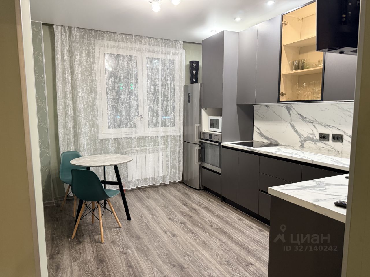 Кухня просторная, площадью 12 м², оснащена современной техникой: холодильником, плитой, микроволновой печью, стиральной и посудомоечной машиной. Имеется кухонная утварь и посуда. При необходимости заберем.