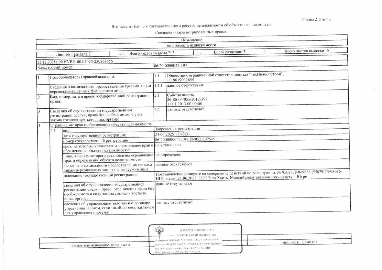 Должник: ООО "ТехИнвестСтрой", собственник: ООО "ТехИнвестСтрой" Лот: Нежилое помещение, площадь 653,2 кв.м., кадастровый номер: 86:20:0000043:197, г. Нефтеюганск, Пионерная зона, ул. Мира, стр. 9/2, пом. 1, н/ц: 21147400 р., з-к: 3172110 р., код: 0001, рег. 26-71-ГМУ;