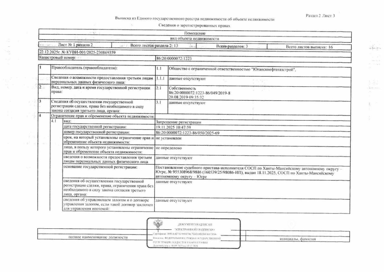 Должник: ООО "ЮганскНефтегазСтрой", собственник: ООО "ЮганскНефтегазСтрой" Лот: Нежилое помещение, площадь 49,2 кв.м., кадастровый номер 86:20:0000072:1223, г. Нефтеюганск, мкрн. 16, д. 2, пом. 172, н/ц: 5486300 р., з-к: 822945 р., код: 0001, рег. 26-82-ГМУ;
