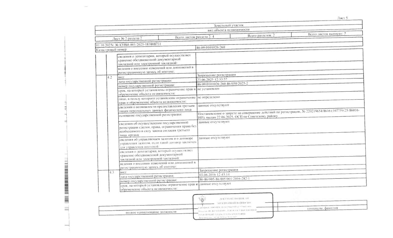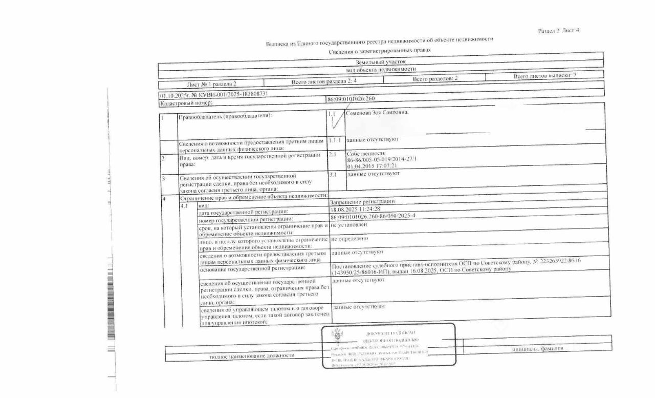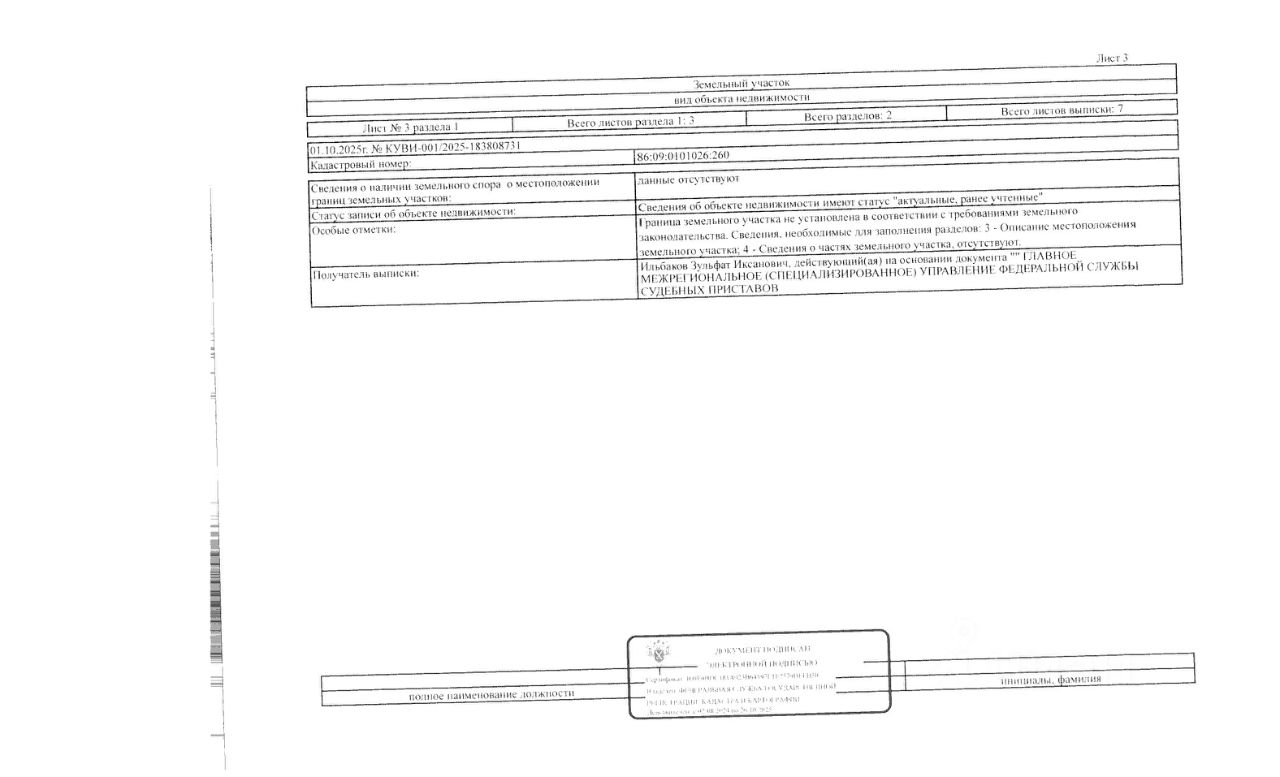 Должник: Семенова З.С., собственник: Семенова З.С. Лот: Земельный участок (земли населенных пунктов, под коллективное садоводство), площадь 1200 кв.м., кадастровый номер 86:09:0101026:260, Советский р-н, г. Советский, с/т Букет, 21:09, (В соответствии с п. 21.1 ст. 26 ФЗ 218 "О государственной регистрации недвижимости" в ЕГРН отсутствуют сведения о местоположении границ данного земельного участка, что является основанием для приостановления процедуры государственной регистрации права собственности. Настоящим участники торгов уведомляются что обязанность по установлению границ земельного участка возложена на победителя аукциона, все расходы на проведение данной процедуры производятся силами и средствами победителя аукциона и МТУ Росимущества не компенсируются), н/ц: 123930 р., з-к: 18590 р., код: 0001, рег. 26-57-ГМУ;