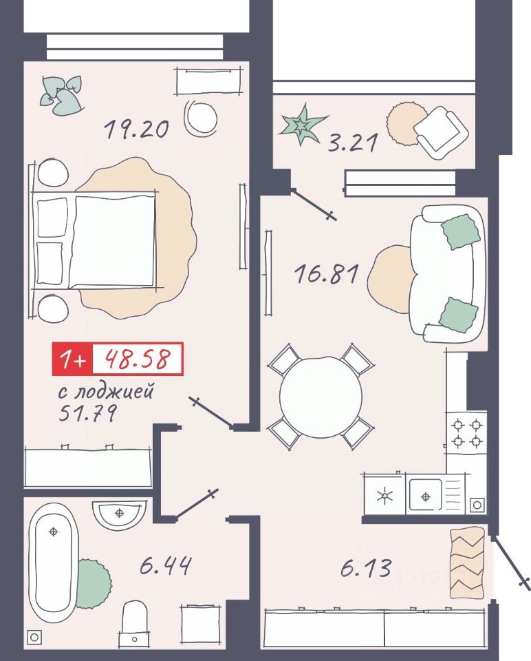 Общая площадь48,58 м²