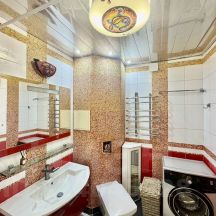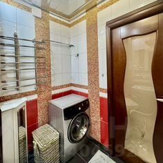 в ванной комнате: тумба с раковиной, зеркало, стиральная машина;