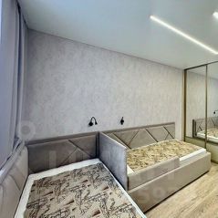 в спальне: встроенная гардеробная с зеркалами, кровать, прикроватные тумбы, туалетный столик, пуф;