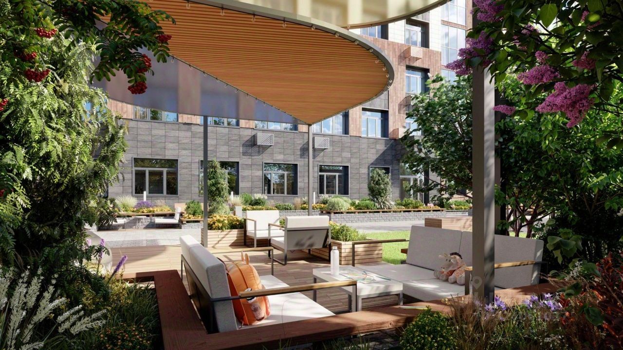 Восьмиэтажная застройка облицована в современном стиле из эко-материалов с текстурой камня и дерева. Растения в вазонах и деревянные элементы окунут вас в атмосферу хвойного леса.