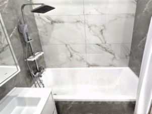 Ванная комната — пример сочетания эстетики и практичности. Навесной шкаф аккуратно скроет всё необходимое для хранения. Инсталляция и подвесная тумба под широкой раковиной облегчают уборку. Стены по периметру выложены широкоформатным керамогранитом — надёжность, долговечность и стиль в одном решении. Дополнительно установлен бойлер — горячая вода будет у Вас всегда, независимо от сезонных отключений.