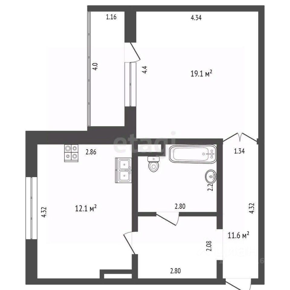 Продаётся 1-комнатная квартира 52,2 м² в доме с газом!