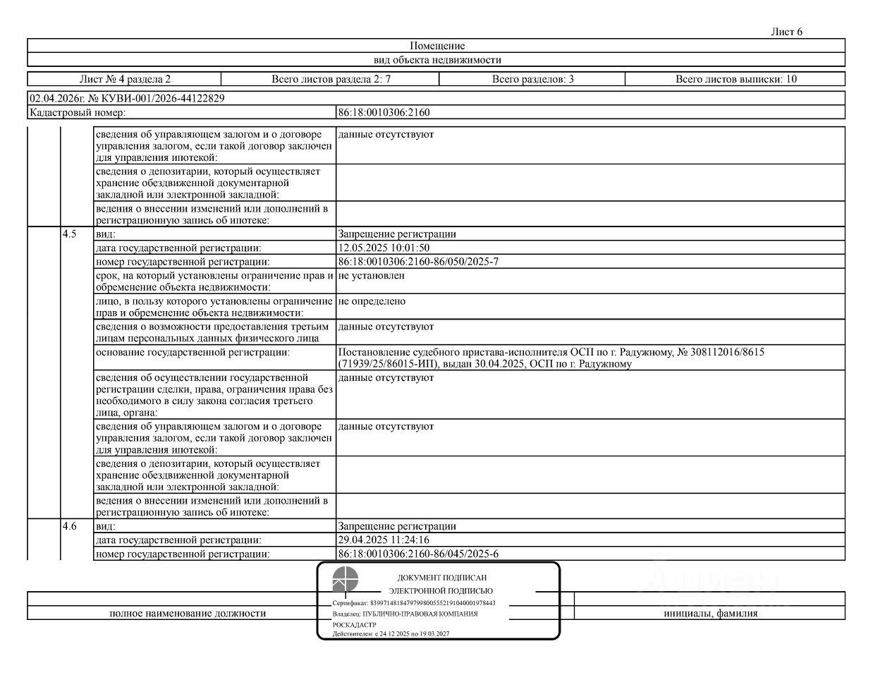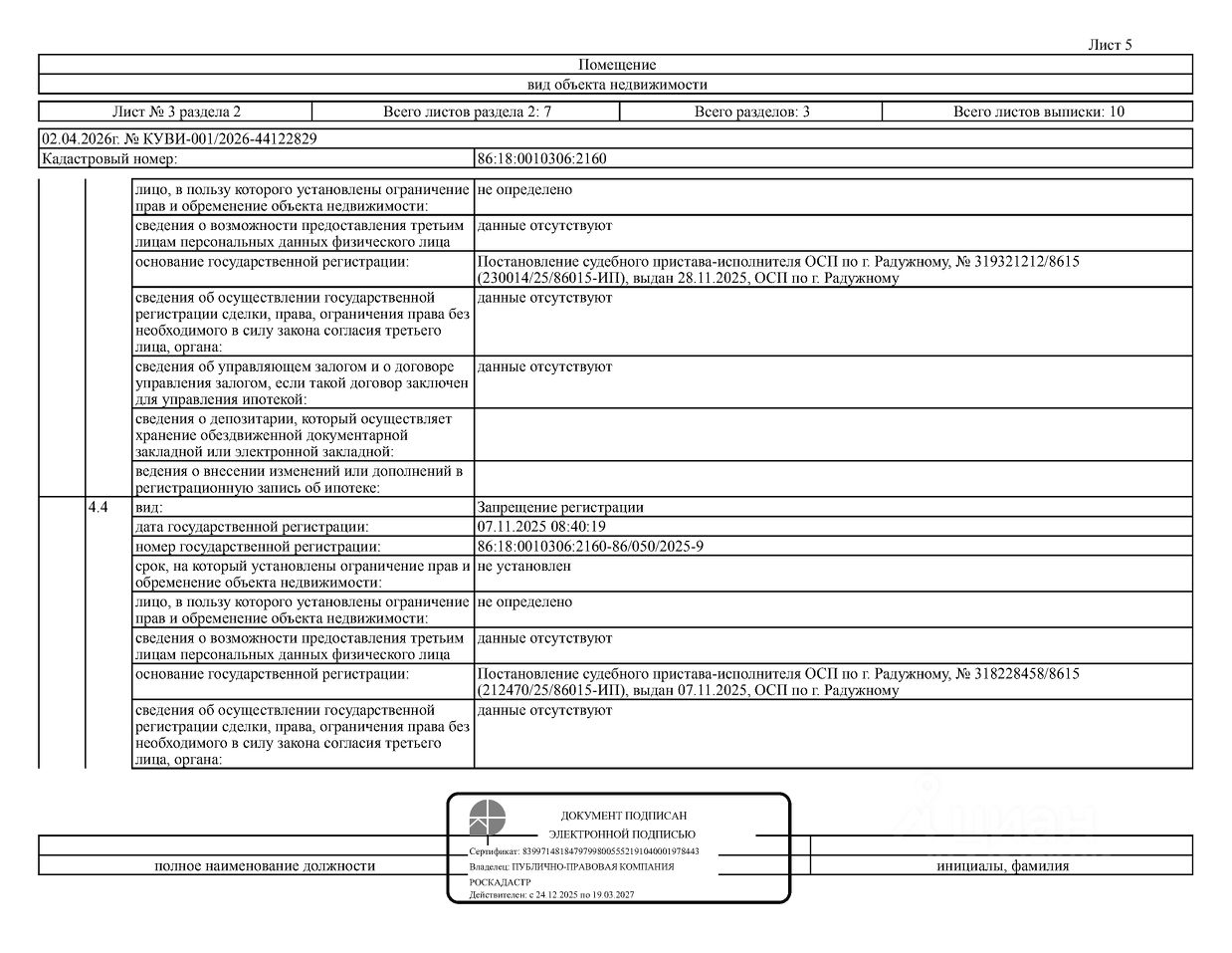 Должник: Иванов А.В., собственник: Иванов А.В. Лот: Жилое помещение (квартира), площадь 109,5 кв.м., кадастровый номер: 86:18:0010306:2160, г. Радужный, мкр. 6-й, д. 3, кв. 3 (зарегистрировано 8 взрослых, 1 ребенок, задолженность за кап. ремонт на 22.01.2026 50 т.р.), н/ц: 1552000 р., з-к: 1552 р., код: 0014, рег. 26-103;