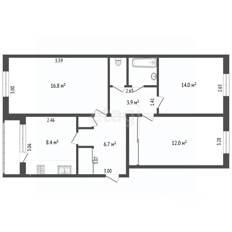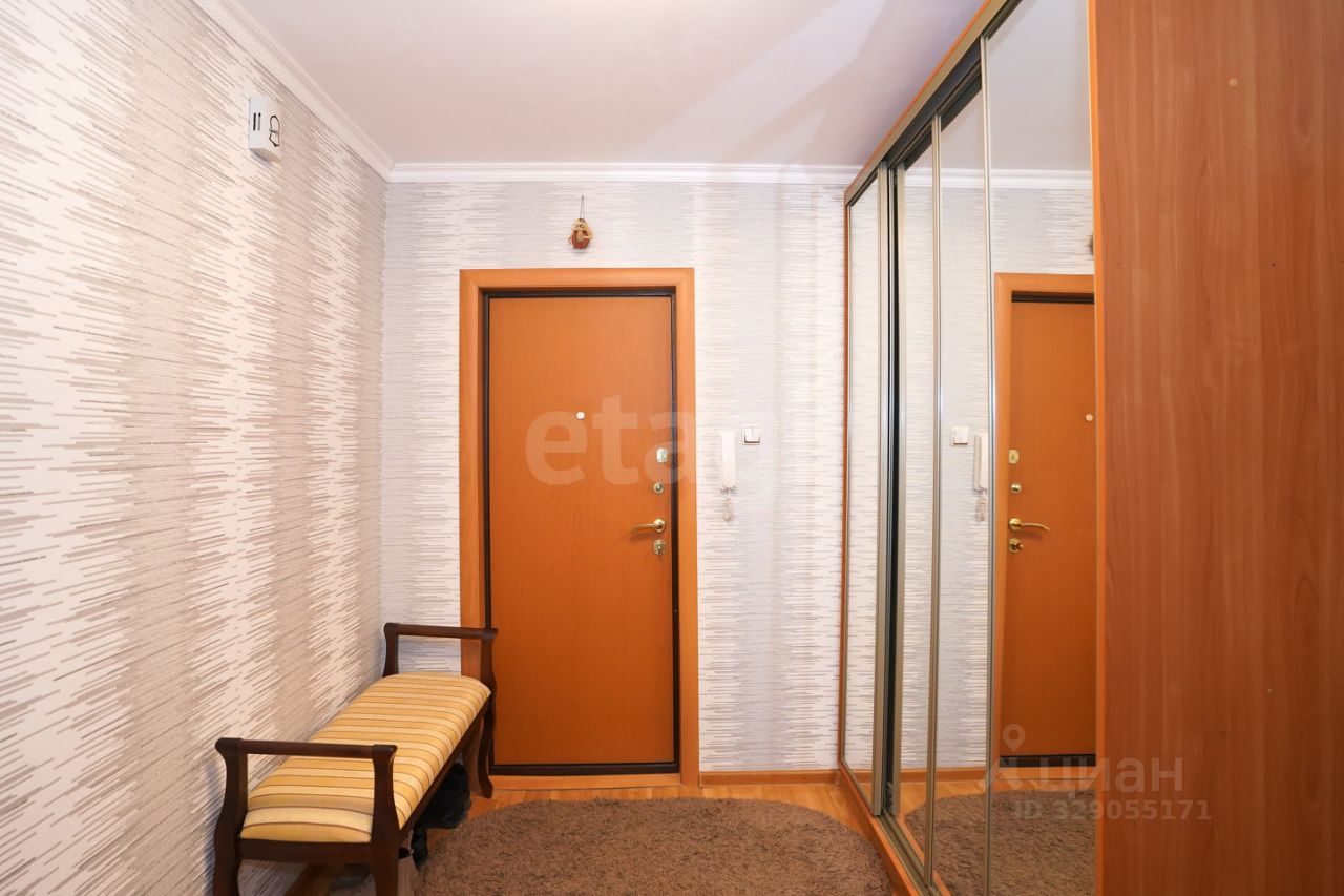 Кухня оборудована необходимой техникой, включая посудомоечную машину. В квартире остаётся мебель: кухонный гарнитур, встроенный шкаф, кровать с комодом и тумбами, шкаф в прихожей. Санузел раздельный.