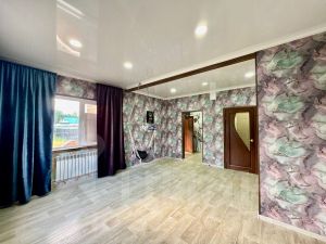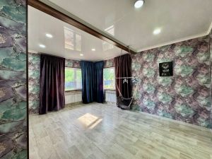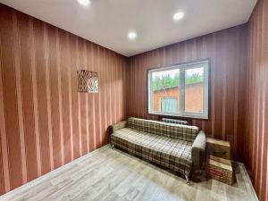 - гостиная, с двумя большими окнами, выходящими в уютный двор, с теплым полом. Здесь натяжной белый глянцевый потолок, на полу - линолеум, на стенах-современные обои. Комната удобной планировки, с нишей под диван, либо компьютерную зону. Это место для отдыха, просмотра тв., приёма гостей. и тд.