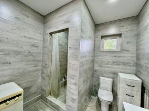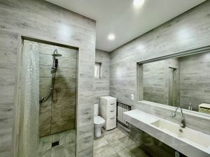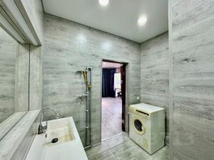 - слева от гостиной расположен санузел, совмещённой с душевой кабиной. Оснащен современной тумбой с большой раковиной, большим зеркалом, стиральной машиной. Стены выполнены из ламината, теплый пол с поверхностью - керамогранит, душевая также из керамогранита в дополнении с тропический душем, натяжной белый матовый потолок.