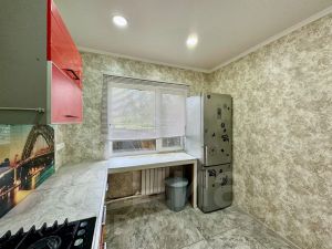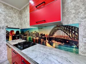 - просторная кухня: теплый пол - светлый керамогранит 60х60см., на стенах - обои, потолок натяжной белый глянец, в потолке вытяжка. Столешница кухни выполнена из широкоформатного керамогранита (очень устойчив к механическим повреждениям), каменная мойка. Варочная панель газовая на 4 комфорки. Кухня так же оснащена холодильником.
