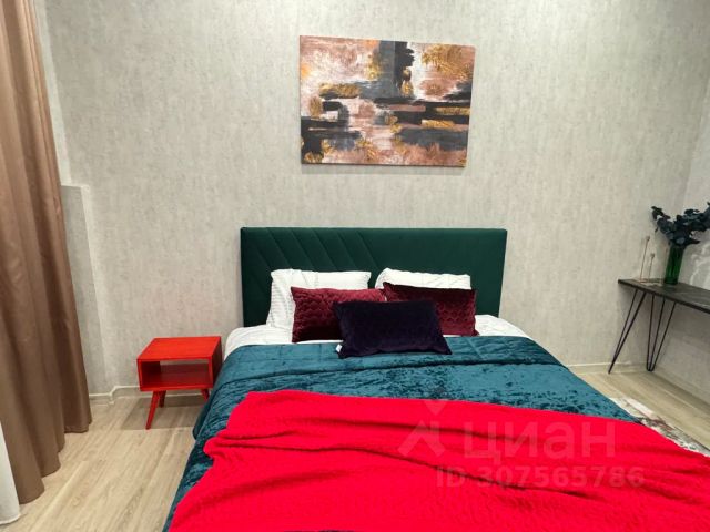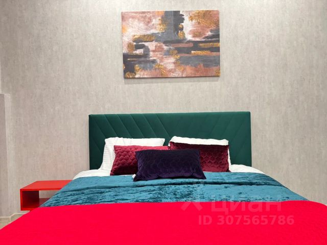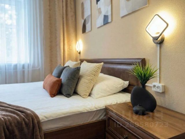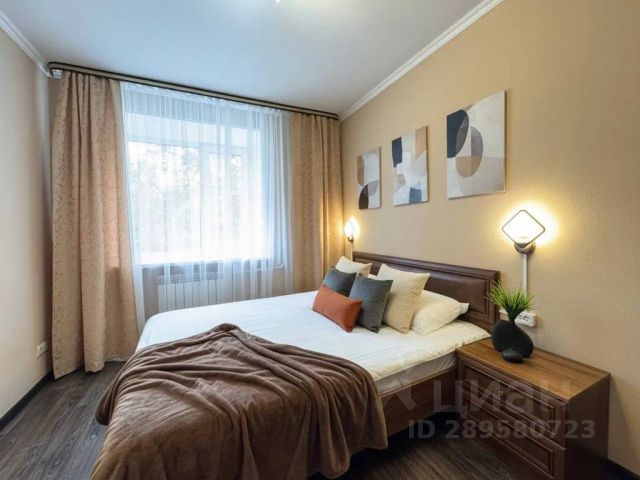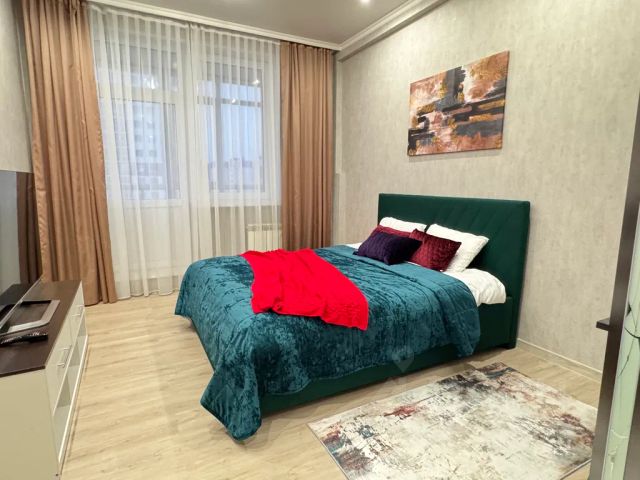 В другой спальне с оригинальным дизайном расположено третье двуспальное место - комфортная кровать с ортопедическим матрасом, который гарантирует спокойный сон. Атмосферу уюта дополняют плотные портьеры и нестандартные прикроватные тумбы со светильниками. Для личных вещей предназначен шкаф-купе с зеркальной створкой.