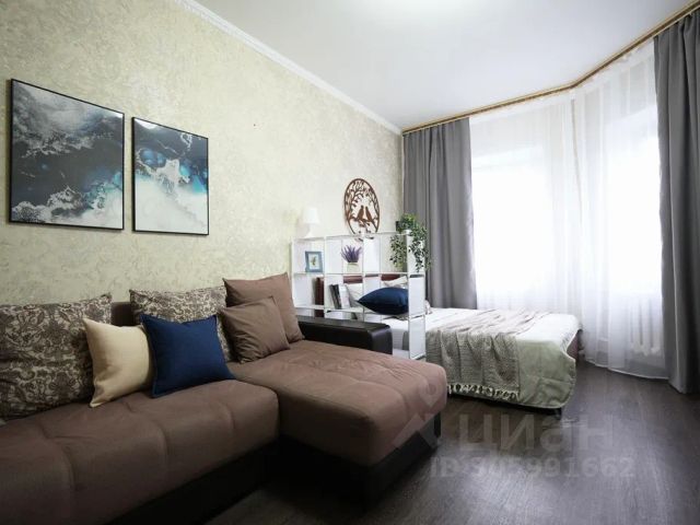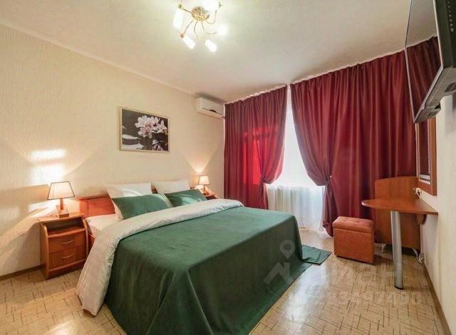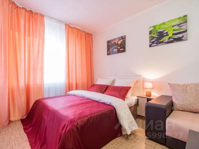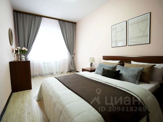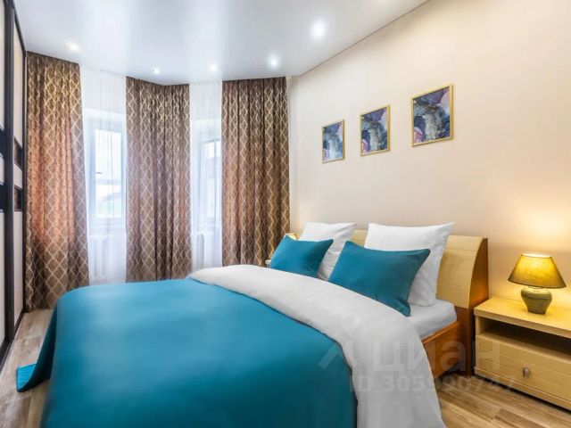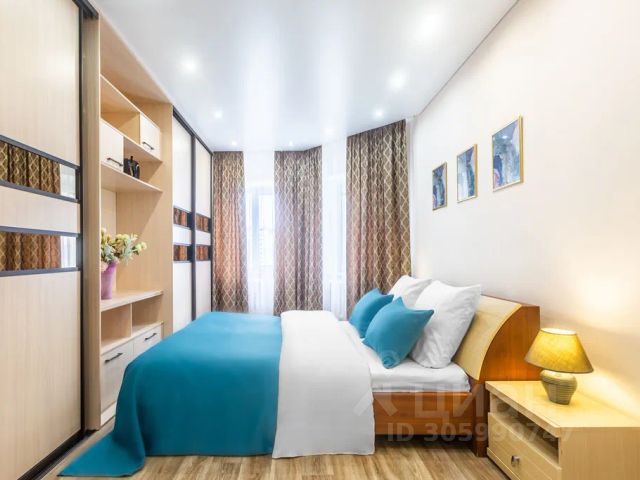 В другой спальне с оригинальным дизайном расположено третье двуспальное место - комфортная кровать с ортопедическим матрасом, который гарантирует спокойный сон. Атмосферу уюта дополняют плотные портьеры и нестандартные прикроватные тумбы со светильниками. Для личных вещей предназначен шкаф-купе с зеркальной створкой.