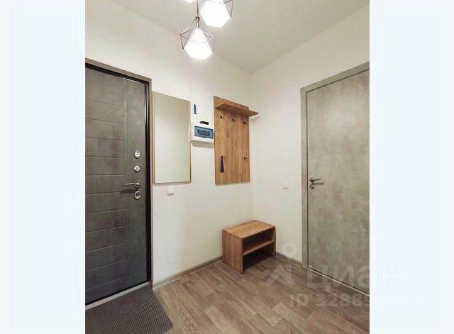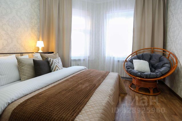 В другой спальне с оригинальным дизайном расположено третье двуспальное место - комфортная кровать с ортопедическим матрасом, который гарантирует спокойный сон. Атмосферу уюта дополняют плотные портьеры и нестандартные прикроватные тумбы со светильниками. Для личных вещей предназначен шкаф-купе с зеркальной створкой.