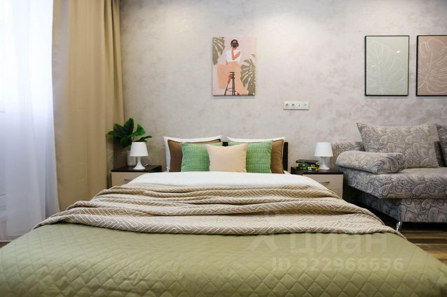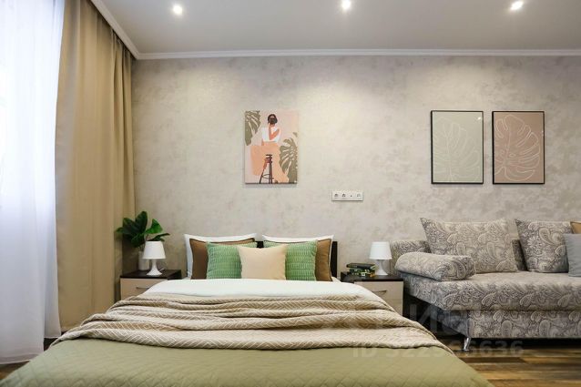 В другой спальне с оригинальным дизайном расположено третье двуспальное место - комфортная кровать с ортопедическим матрасом, который гарантирует спокойный сон. Атмосферу уюта дополняют плотные портьеры и нестандартные прикроватные тумбы со светильниками. Для личных вещей предназначен шкаф-купе с зеркальной створкой.